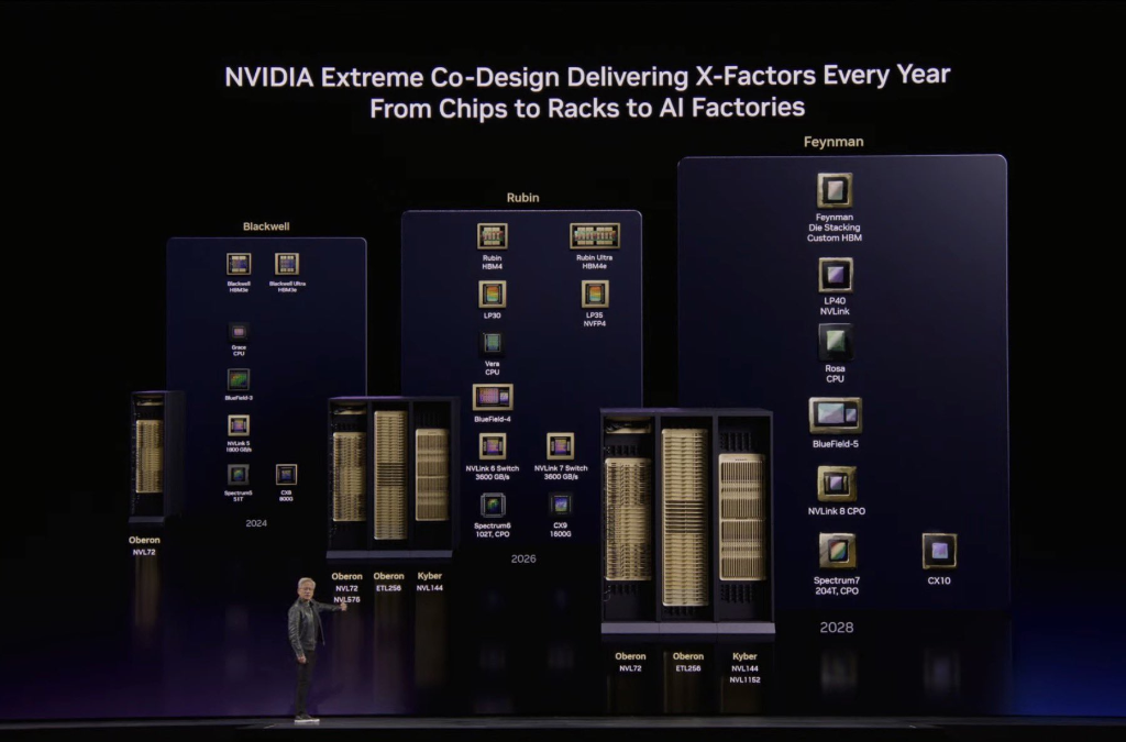 Vera Rubin(当前):Kyber机架,NVLink 144(铜缆);Oberon机架,NVLink 72 + 光学,扩展至NVLink 576;Spectrum 6,全球首款CPO交换机