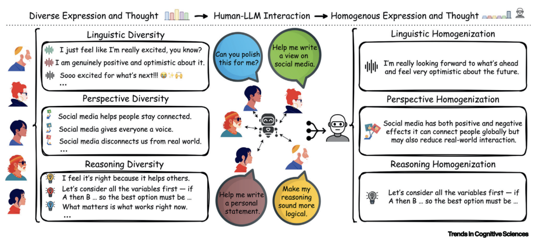 由大语言模型(LLM)介导的表达和思维同质化:个体在写作、推理和世界观存在差异。当这些差异通过相同的 LLM 进行调节时,他们原本独特的语言、视角和推理信号就会变得同质化,从而在使用者之间产生标准化的表达和思维。