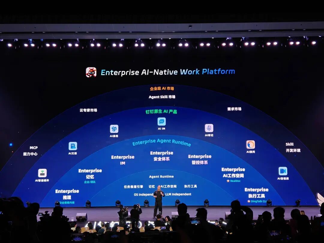 这正是 Skill 即生产力的核心逻辑:把行业专家的隐性经验,变成人人可调用的标准化能力。Skill 不只是提高效率,它在重新分配能力——让不具备专业背景的人,也能获得专业级的产出。这个逻辑的更大野心,体现在钉钉同步上线的 AI 能力市场。Anthropic 推出 Claude Skills 开放标准后,微软、OpenAI、Cursor 等巨头迅速跟进。行业共识正在形成:下一阶段的竞争,不是「谁的模型更强」,而是「谁的 Skill 生态更完整」。钉钉 AI 能力市场覆盖 Skill、Agent、Service 完整体系,从开发、审核、上架、分发到管理,全链路打通。企业可以把资深员工的方法论固化成私有 Skill,彻底摆脱人才流失的阵痛;开源社区里数千个现成的能力,也能在企业级安全架构下被随时调用。这是悟空最有想象力的部分,它在搭建 AI 时代的生产力基础设施——Skill 是这套基础设施里流通的「货币」,谁掌握更多高质量的 Skill,谁就掌握了 AI 时代更大的生产力。AI 新硬件除了软件,在这场发布会上,钉钉还发布了多款 AI 硬件。DingTalk A1 Pro:录音卡形态,专为会议和工作场景设计,支持多麦克风阵列拾音,AI 实时转录、翻译、摘要,把「开完会还要整理纪要」的低效循环彻底斩断。Cleer H1 AI 耳机:钉钉与 Cleer 联名推出,首款与悟空深度联动的 AI 耳机。戴上耳机,语音即可直接与悟空对话下达指令,无需打开屏幕,从而实现真正的「所想即所达」。更值得关注的是 Real AI 硬件(Realbox):搭载 1 台 PC 环境 + 5 台手机环境,支持多人共用、多并发任务处理。企业部署一台 Realbox,可以同时为多个员工运行多个悟空实例;部署多台 Realbox,可构建 AI 计算机集群,任务并行处理,弹性扩展。不难看出,钉钉这些 AI 硬件并不是独立存在市面上的同类产品抢夺市场,核心都是为了更好地打通 AI 工作流,成为软硬一体的 AI 原生工作平台。OpenClaw 跑在一台电脑上,做一台电脑能做的事;悟空搭载 Realbox 集群,正式宣告:AI 算力,可以像水电一样,以基础设施的形式在企业内部流通了。AI 时代的组织生产力在观看这场发布会时, 我想起前段时间 Sam Altman 在采访中提到的观点:「历史上第一家由一个人独立运营的十亿美元公司,即将出现。」彼时龙虾还没火爆,一人团队(OPT)的概念也只是在 AI 圈子里。他没有解释这个人会用什么工具,会在哪里,会干哪个行业。但看完这场发布会,这句话变得具体了一些。这个人,大概率会有一套像悟空这样的东西在身边。过去十一年,钉钉一直在让人学会用工具。悟空想做的,是逐渐让工具真正学会理解人。当工具开始理解人,一件以前不可能的事情正在变得可能:组织生产力,第一次可以真正被数字化封装、分发和扩展。当 Skill 把行业专家的经验变成人人可调用的能力货币,当 AI 原生平台成为个体接入组织能力的操作系统,一个人或组织能做的事情的边界,将被彻底重新定义。Sam Altman 看到的是「一人公司」这个终点,悟空要做的,是让更多普通人有机会走到那条路上。它不是专门为天才准备的工具,而是为所有「想做更多但苦于一个人精力有限」的人,提供一套 AI 时代的组织生产力基础设施。AI 原生工作平台,正在成为这个时代最关键的组织变量。 谁先跑通它,谁就先拿到了超级个体时代的入场券。之前有一个观点,燃烧 Token 的速度,决定了人的进化速度。而悟空的 1.0 版本,指向的就是人和组织进化的下一个版本。