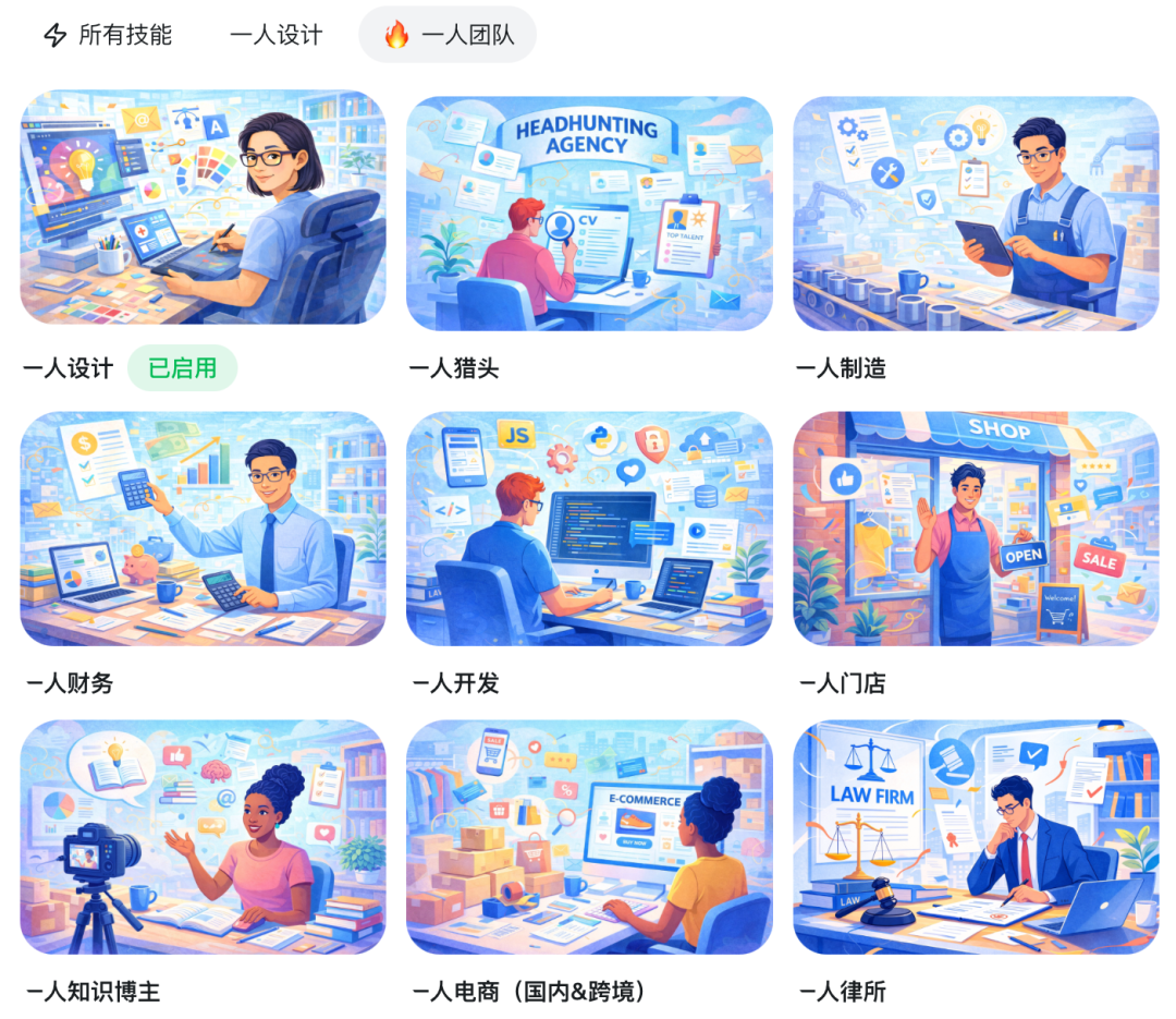 用户一键启用,即刻拥有一支精通行业技能的「Agent团队」。