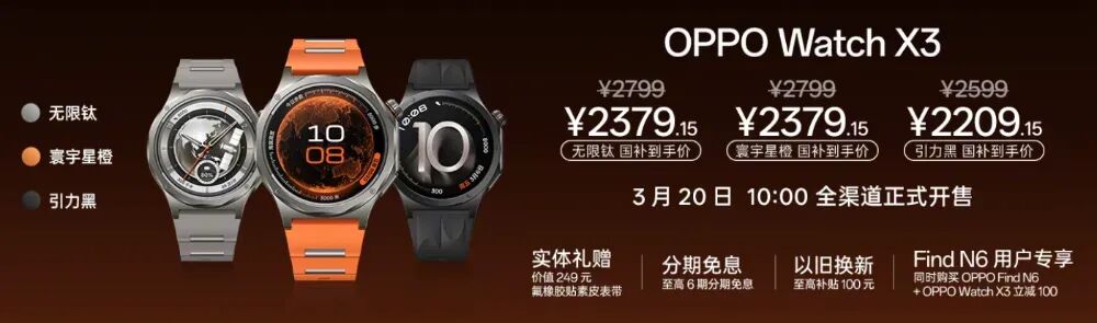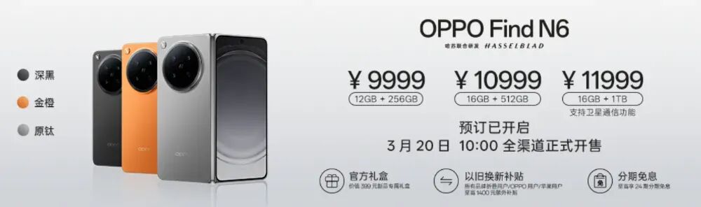 配备6.62 英寸外屏,采用极窄边框设计,FHD+ 2616×1140分辨率。搭配 8.12 英寸内屏,QXGA+ 2480×2248 分辨率。内外双屏均搭载 1nit 明眸护眼屏,内外屏全局峰值亮度提升至 1800nits。通过了德国莱茵 TÜV「金标」护眼认证。为了解决久用后折痕加深的问题,OPPO Find N6 带来了新一代钛合金天穹铰链,采用仿生对称四轴结构,相较传统三轴铰链,扭力提升 20% 的同时,让铰链表面起伏从 0.18 mm 降至 0.1 mm。带来芯片级高分子 3D 打印技术,让铰链中板平整度至高提升 75%。还打造了专门的产线,让每一台 Find N6 的铰链都拥有极致统一的平整表现。采用超坚固新型基材,至高可承受 5 公斤重压。通过深度化学强化工艺,让抗弯曲形变能力提升至传统柔性玻璃的 338%,弯折后可实现 99.9% 的形状自修复。基于此,OPPO Find N6 成为全球首款通过德国莱茵 TÜV 无感折痕“连续 60 万次折叠测试 久用平整”认证的折叠旗舰,还是德国莱茵 TÜV 实验室测试过的“全球最平整折叠手机”。防护能力方面,OPPO Find N6 支持 IP56 / IP58 / IP59 满级防水,在 -20℃ 环境中依然能顺畅开合。主副屏均配备2000 万像素摄像头,后置搭载哈苏 2 亿超清主摄、5000 万像素潜望长焦镜头、5000 万像素超广角摄像头,还有丹霞色彩还原镜头。配合 OPPO 自研 LUMO 超像素引擎,支持哈苏大师模式、哈苏 XPAN 宽幅模式等哈苏体验。核心搭载第五代骁龙 8 至尊版移动平台,内置6000 mAh 冰川电池,搭配 80 W 有线超级闪充、50 W 无线闪充。目前,已有 2500 万台车型的无线充电系统全面融入 OPPO 无线闪充生态。“OPPO AI 手写笔”,笔身搭载专属 AI 按键,一按即圈,无需截图就能快速圈选屏幕任意内容,完成批注、分享、编辑等操作。搭配专属保护壳可实现便捷收纳与磁吸充电,充电 3 分钟即可连续书写 1 小时。OPPO Find N6 带来了全面升级的全景自由窗分屏方案,最多支持 4 个应用窗口同时开启。搭载系统级多功能快捷键,带来“AI 一键闪记”功能。支持 Windows、Mac 设备的远程控制与文件流转,并深度打通苹果全家桶,让双持用户在不同设备间切换自如。OPPO Find N6,12+256GB 售价 9999 元,16+512GB 售价 10999 元,16+1TB 售价 11999 元。另外,活动中还带来了OPPO Watch X3,“引力黑”售价 2599 元,“寰宇星橙”、“无限钛”售价2799 元。全新升级无感高血压风险评估,全新 AI 运动教练。升级全新手势操作与超级小布、无感开车门。综合来看,OPPO Find N6在改善屏幕折痕方面进行了全新提升,产品配置部分也带来了升级。