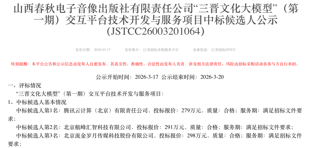 3月17日,山西春秋电子音像出版社有限责任公司发起的“三晋文化大模型”(第一期)交互平台技术开发与服务项目开标,腾讯云计算(北京)有限责任公司中标,投标报价279万元。