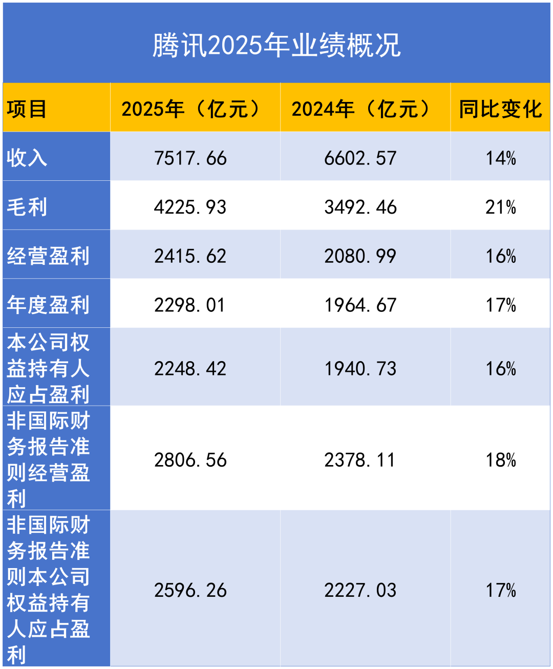 据财报,2025年,腾讯实现总收入7518亿元,同比增长14%;毛利4226亿元,同比增长21%。按非国际财务报告准则,经营盈利2807亿元,同比增长18%,经营利润率提升至37%;权益持有人应占盈利2596亿元,同比增长17%。