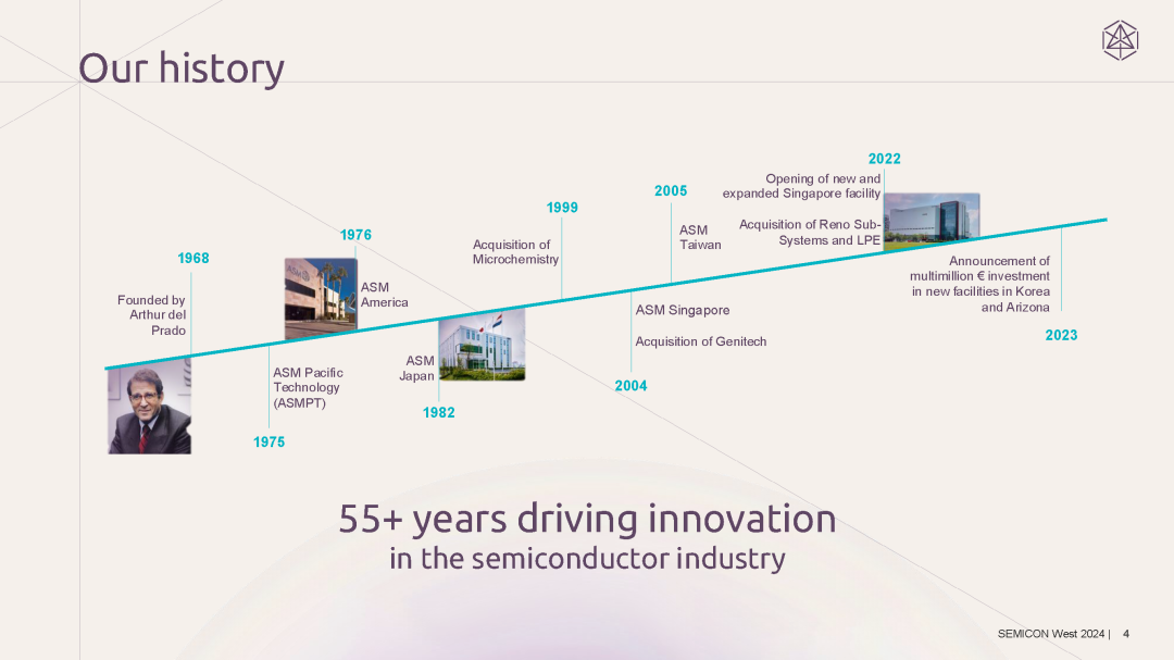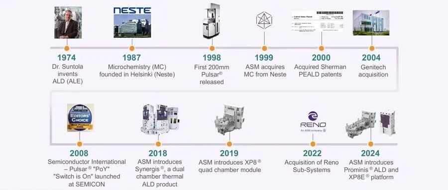 本文主要简述作为 ALD 设备代表的 ASM 发展史以及其 ALD 产品线。ASM于 1968 年在荷兰成立,正值半导体行业刚刚起步之时。创始人 Arthur del Prado(1931-2016年)担任首席执行官直至 2008 年。之后由其子 Chuck del Prado 接任,他担任首席执行官至2020 年。2024 年 5 月,前首席技术官 Hichem M'Saad,,被任命为首席执行官。ASM 最初进入了熔炉沉积市场,并于 20 世纪 70 年代初在荷兰开始生产这些系统。作为技术进步和全球化的先驱,该公司还开始在全球范围内创办新公司。70 & 80s