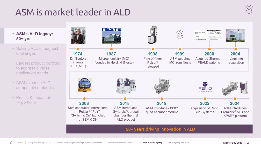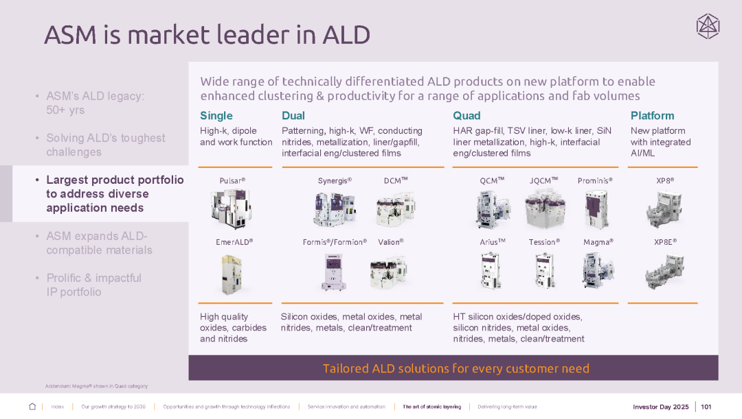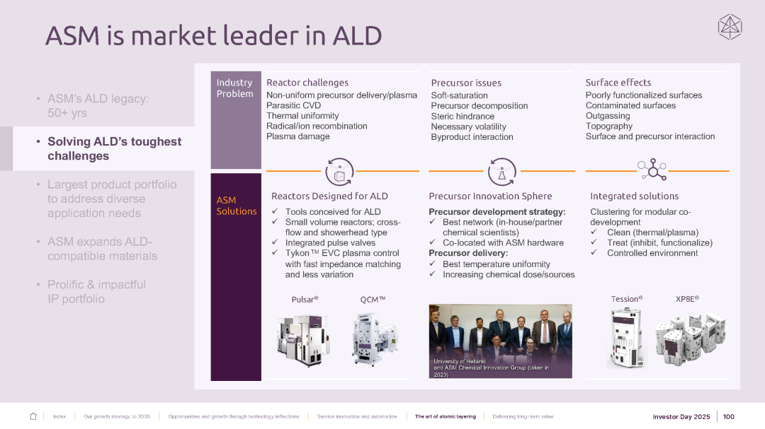 ASM 是半导体制造领域原子层沉积(ALD)设备及工艺解决方案的领先供应商。ALD 是市场上最先进的沉积方法,能够制造出具有卓越材料质量、均匀性和共形性的超薄薄膜。ALD 是晶圆制造设备市场中增长最快的领域之一,而 ASM 拥有最广泛的 ALD 产品组合和应用。