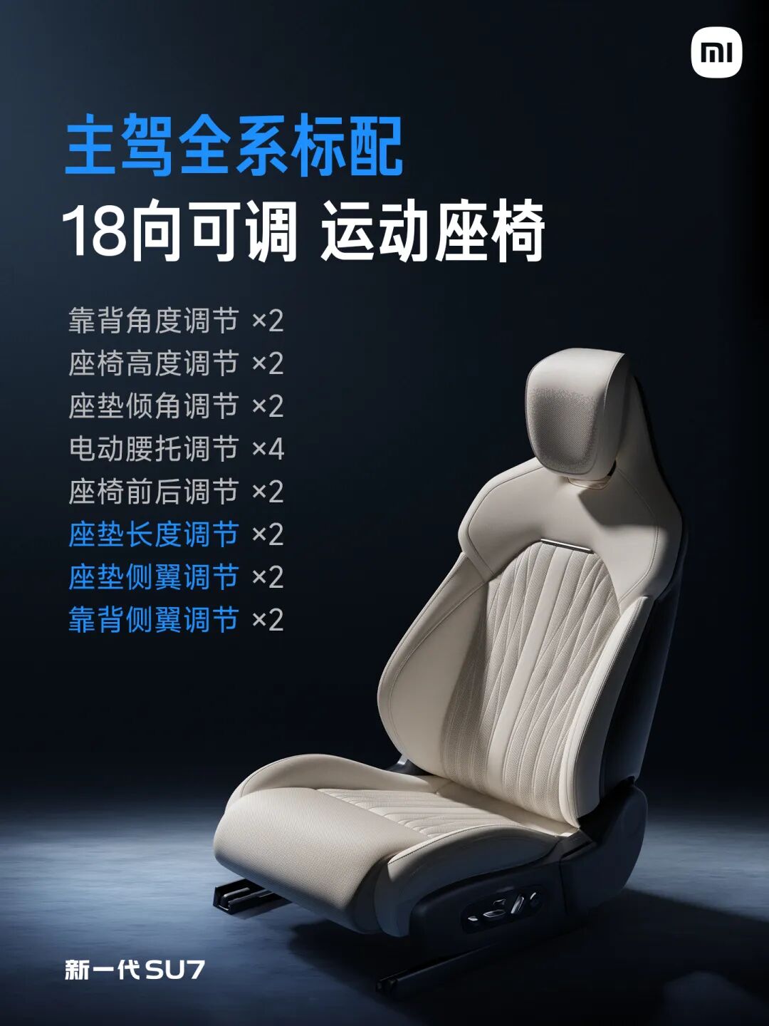 在发布会上,雷军特别重点强调了新一代 SU7 的座椅升级,并邀请用户「到店试坐」。全新的座椅不仅可以对传统的靠背角度、前后距离、高度等进行调节,还可以调节坐垫长度、坐垫侧翼和靠背侧翼。