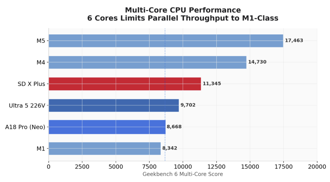 在Geekbench 6的多核心测试中,MacBook Neo的CPU成绩则仅比M1略高。