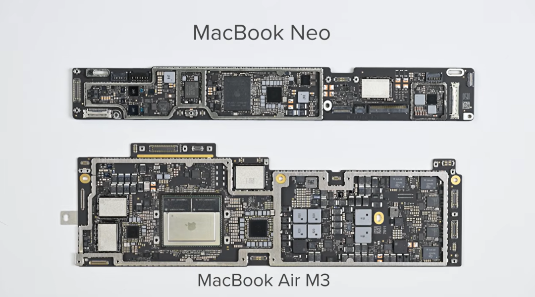 如果将Macbook Neo 的主板和 MacBook Air M3 的主板放在一起比较,区别就显而易见了。