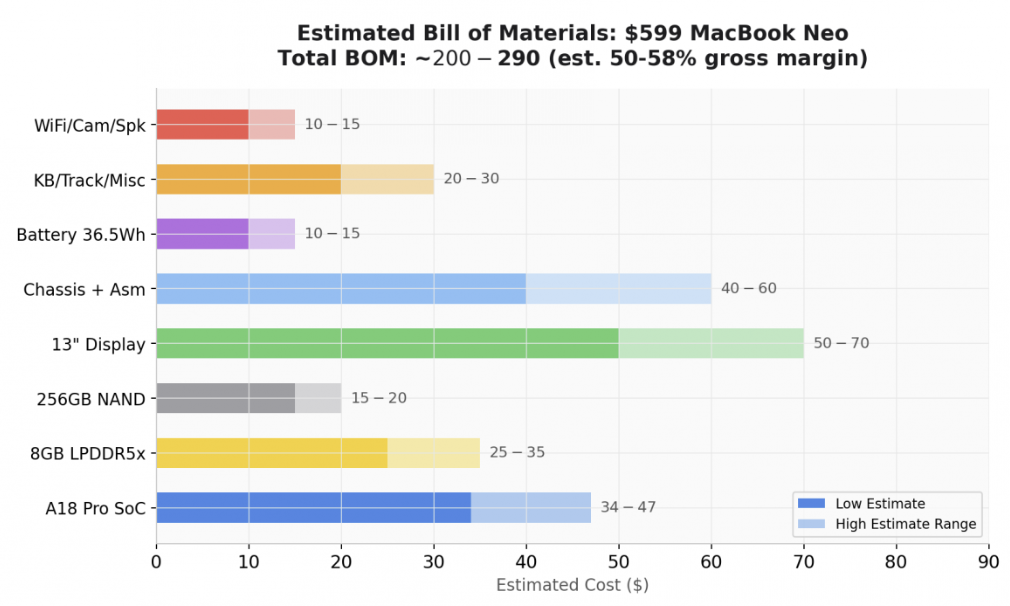 根据分析师JD hodges的分析,Macbook Neo的SoC成本约34-47美元,13英寸显示屏成本约50-70美元,再加上内存、存储、机身、电池、键盘、无线模块等硬件成本,Macbook Neo的总硬件成本约为 200-290 美元。