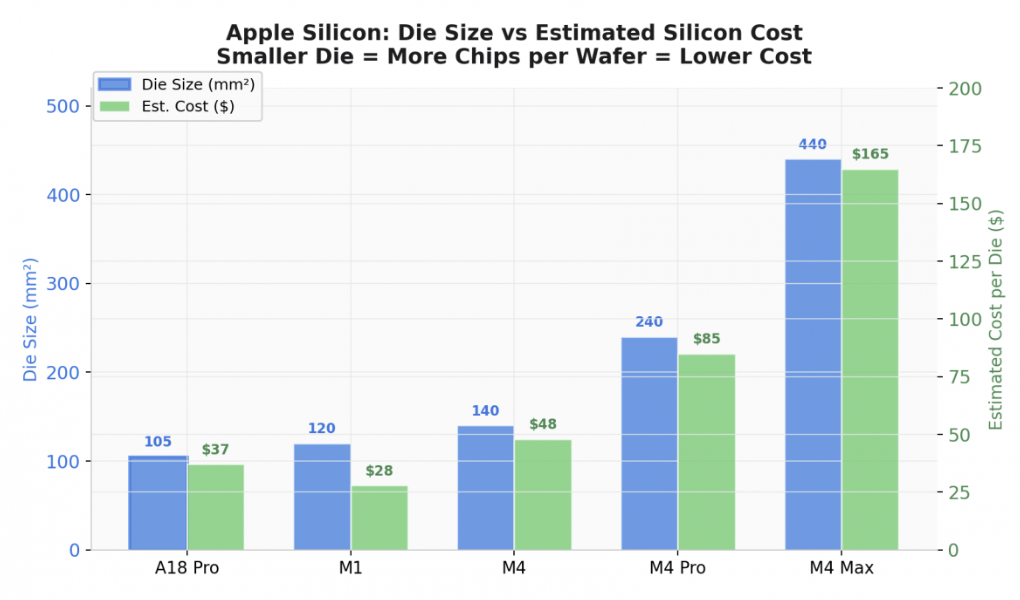 相比之下,M4 芯片面积约为 140 平方毫米,可生产约 430 个芯片;M4 Max 芯片面积约为 440 平方毫米,可生产约 130 个芯片。A18 Pro 芯片的原始的晶圆成本约为 M4 的三分之一,M4 Max 的四分之一。