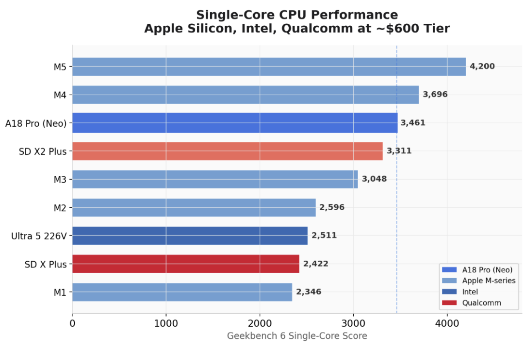 在Geekbench 6的单核心测试中,MacBook Neo的CPU成绩超越了M3和高通骁龙X2 Plus,略低于M4。