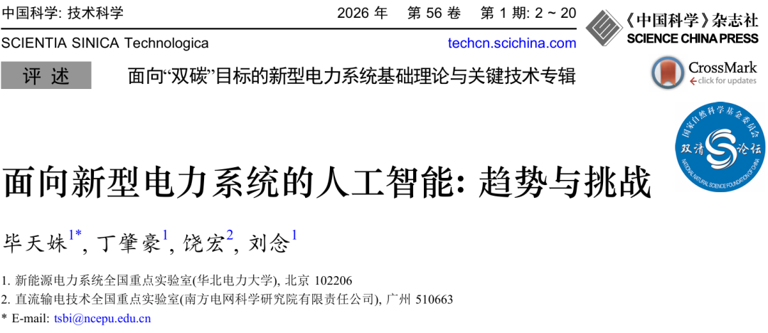 原文信息:毕天姝, 丁肇豪, 饶宏, 刘念. 面向新型电力系统的人工智能: 趋势与挑战. 中国科学: 技术科学, 2026, 56: 2–20