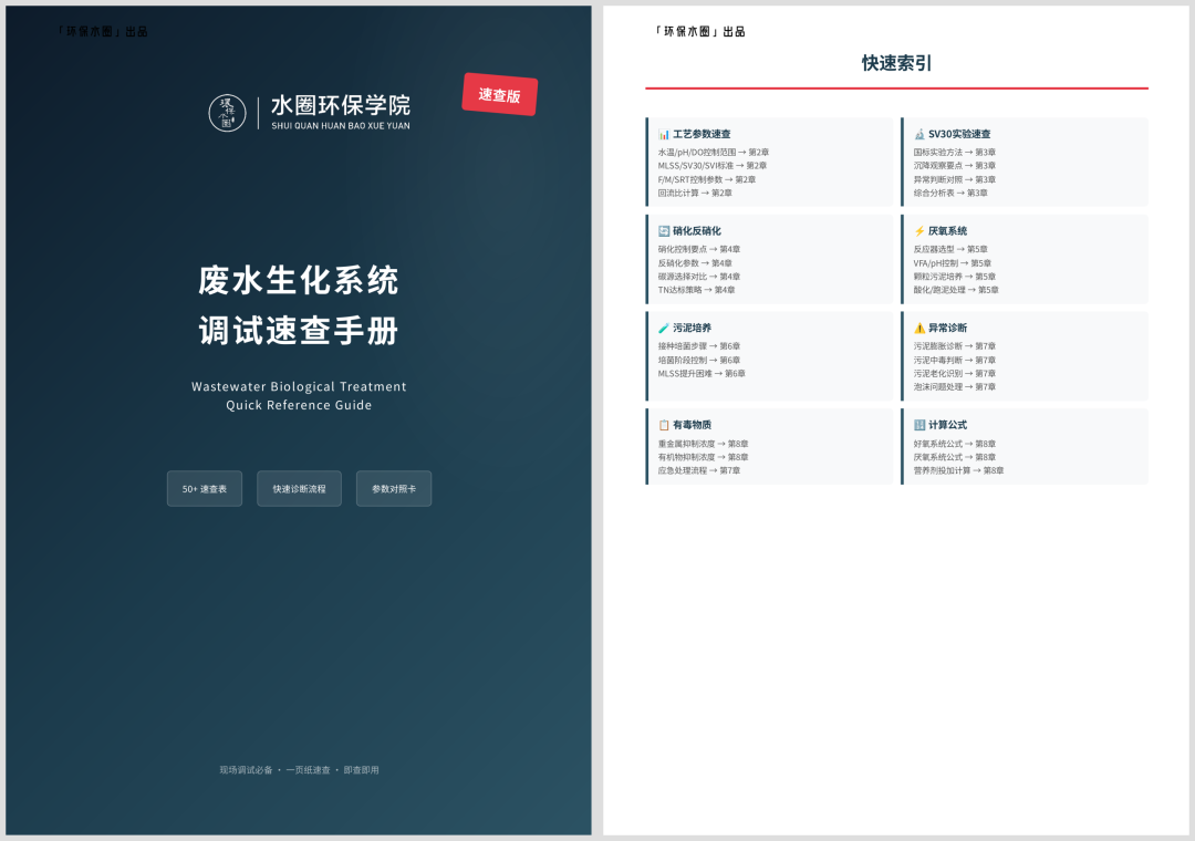 同时,我们为正在看文章的你,准备了一份水圈学院出品的《废水生化系统调试速查手册》电子书,本手册以“速查”为核心设计理念,汇集50+速查表、快速诊断流程,为水友提供即查即用的实用参考。