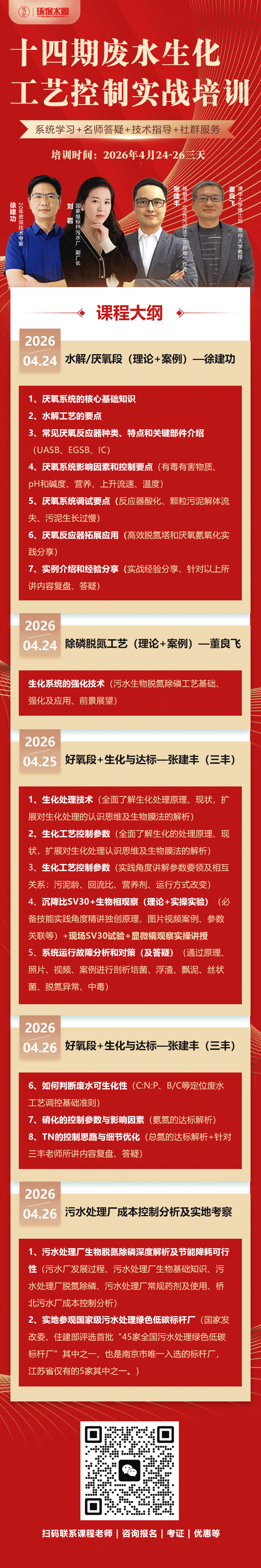 我们4月在南京开办《第14期废水生化工艺控制实战班》,聚焦生化工艺全流程控制与实战能力提升,3天把厌氧/好氧/脱氮除磷/污泥问题讲透。