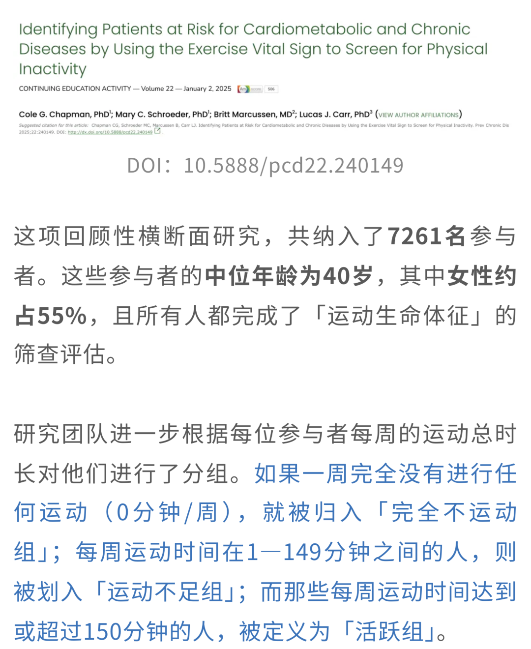 [3]Chapman CG, Schroeder MC, Marcussen B, Carr LJ. Identifying Patients at Risk for Cardiometabolic and Chronic Diseases by Using the Exercise Vital Sign to Screen for Physical Inactivity. Prev Chronic Dis. 2025 Jan 2;22:E02. doi: 10.5888/pcd22.240149. PMID: 39745943; PMCID: PMC11721010.