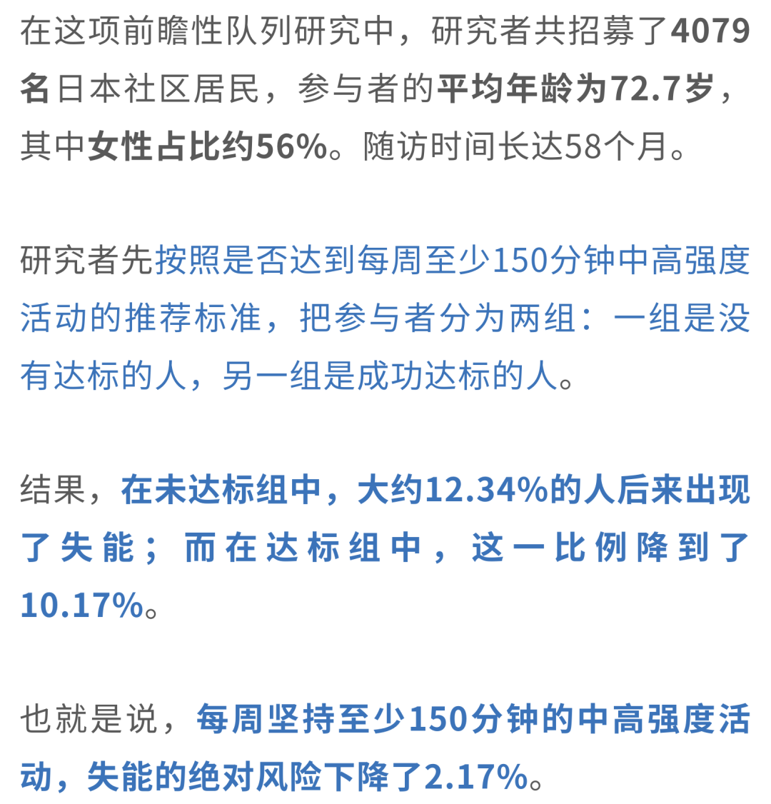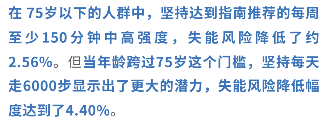 近期,来自日本的学者发表于JECH的一项研究[2]就找到了「运动」这把「钥匙」。这项研究发现,对于75岁以下的人群来说,坚持达到指南推荐的每周150分钟的中高强度身体活动,与显著更低的失能风险相关;而当年龄来到75岁及以上时,每天大约6000步的步行量,或许就已经能够对预防失能产生潜在保护作用。