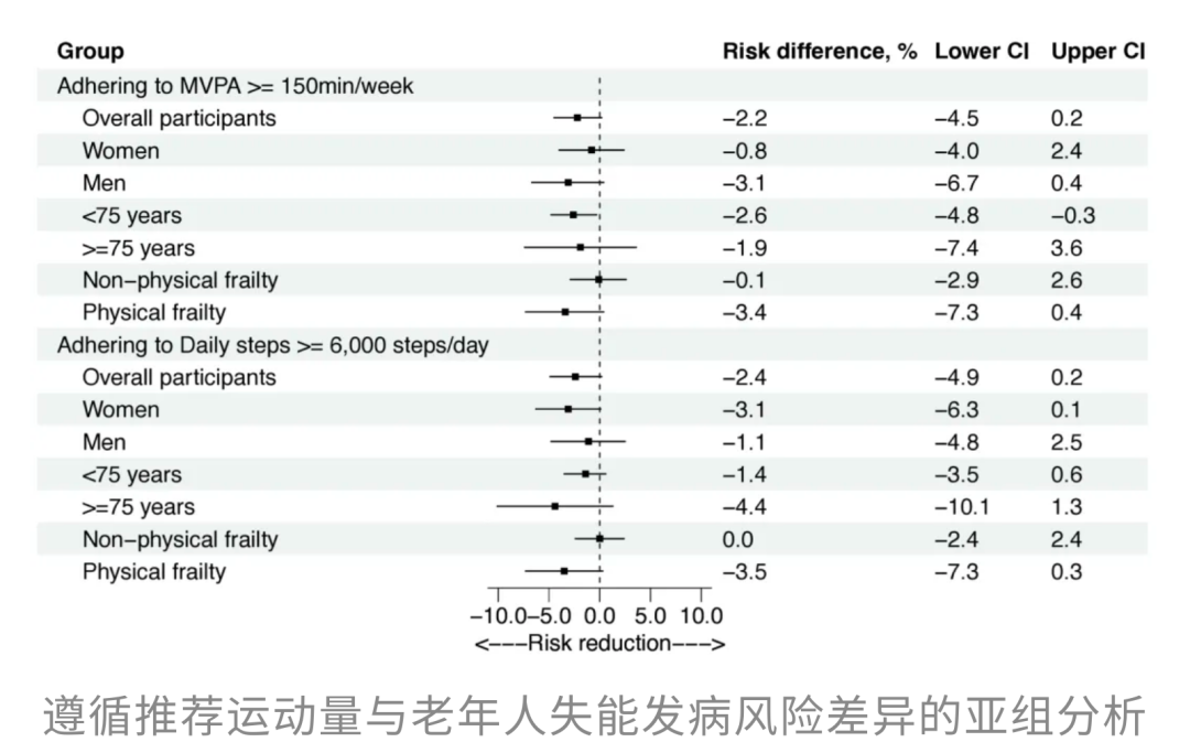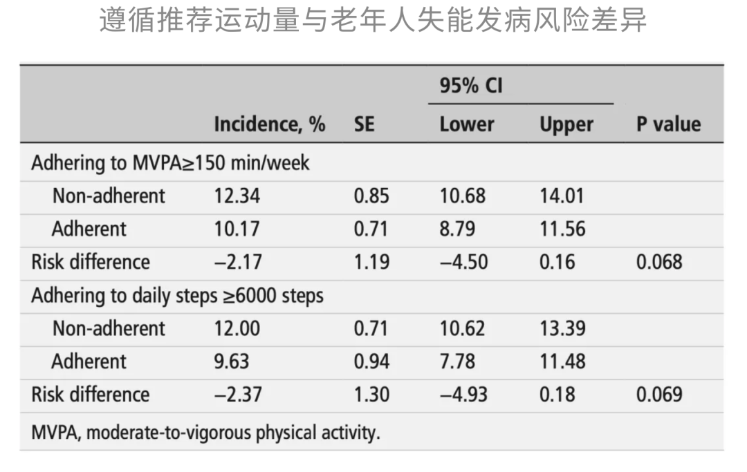 从数值上看,步数达标带来的失能绝对风险下降幅度,甚至比中高强度运动达标还略高一点。