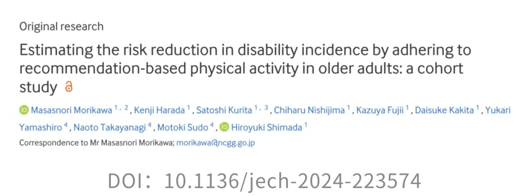 [2]Morikawa M, Harada K, Kurita S, Nishijima C, Fujii K, Kakita D, Yamashiro Y, Takayanagi N, Sudo M, Shimada H. Estimating the risk reduction in disability incidence by adhering to recommendation-based physical activity in older adults: a cohort study. J Epidemiol Community Health. 2025 Sep 10;79(10):796-802. doi: 10.1136/jech-2024-223574. PMID: 40425272; PMCID: PMC12505038.