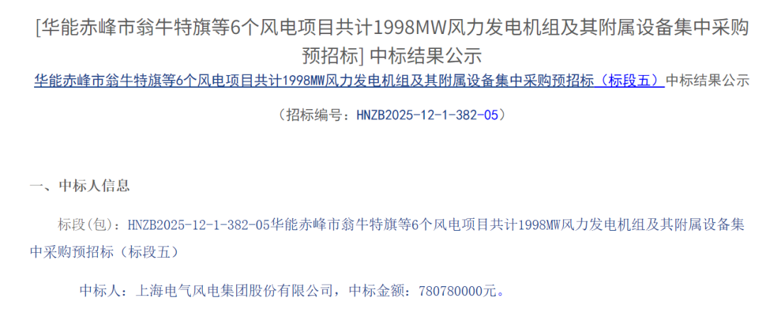 公告显示,上海电气风电集团股份有限公司成功中标该项目,中标价格为78078万元。