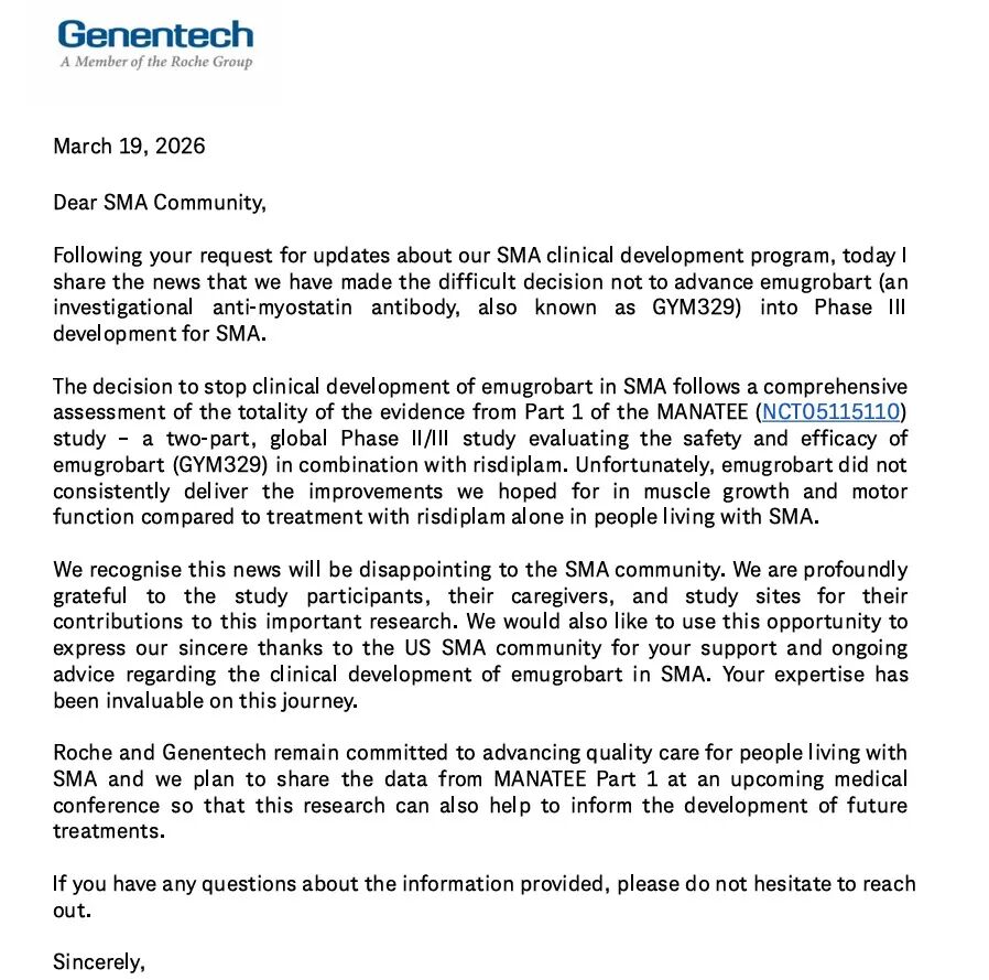 在致脊髓性肌萎缩症(SMA)和面肩肱型肌营养不良症(FSHD)患者群体的信件中,基因泰克宣布,不再将emugrobart推进至3期临床试验阶段。包括终止针对SMA的2/3期Manatee试验,以及针对FSHD的2期Manoeuvre试验。