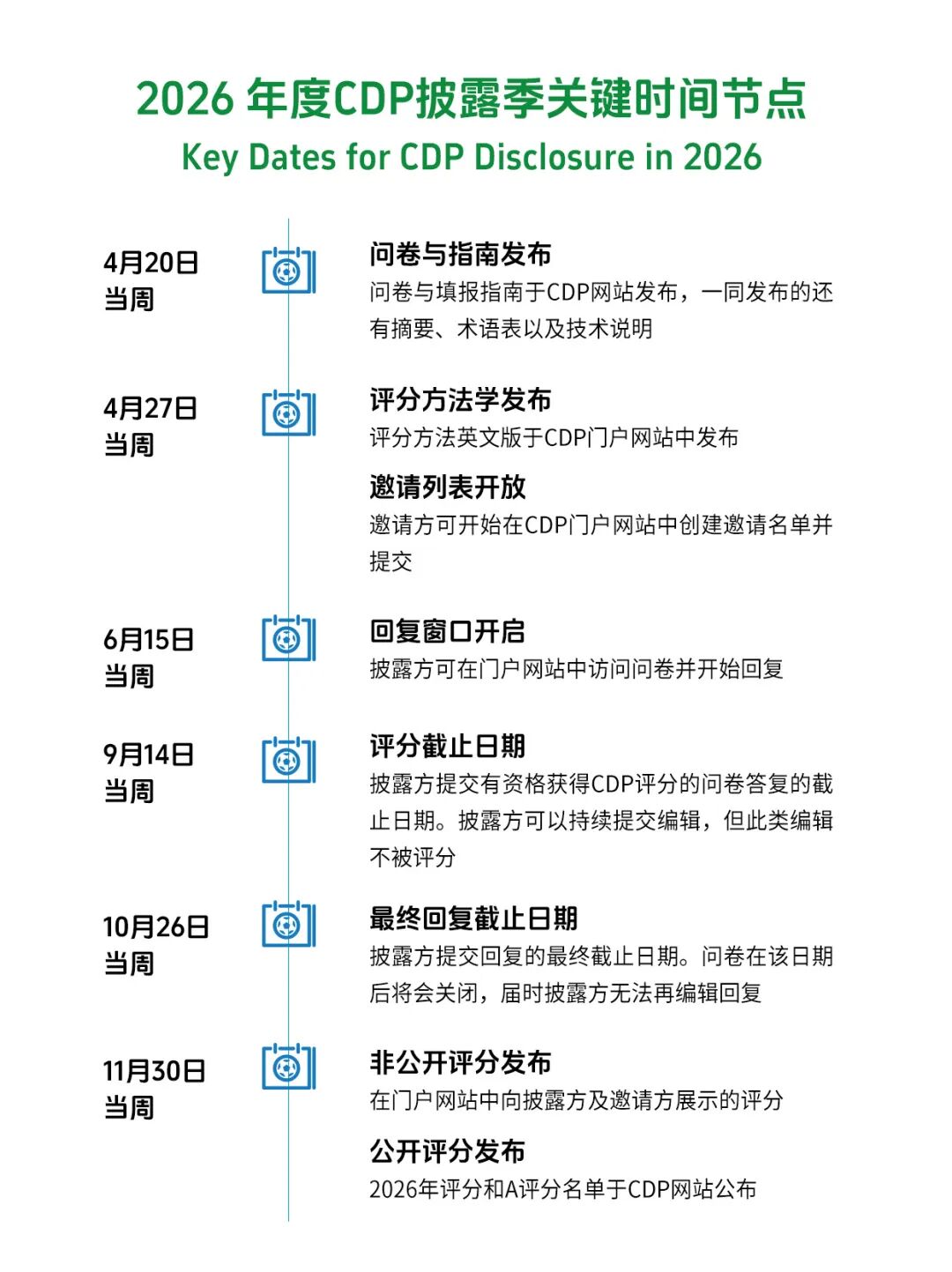 2026年披露季回复窗口将于6月15日当周开放,有资格获得CDP评分的问卷答复的截止日期为9月14日当周。2026年数据集交付的更多细节将在未来几个月公布。