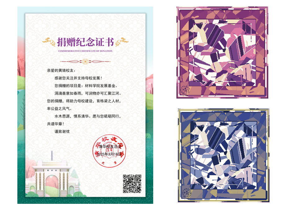 值此115周年校庆之际,特面向广大院(系)友发出捐赠倡议,共同助力材料学院的美好未来。您的每一笔捐赠,将由清华大学教育基金会统一管理,用于支持材料学院建设和发展,助力材料学院谱写新篇章,鼓励以课题组、师门等名义捐赠。