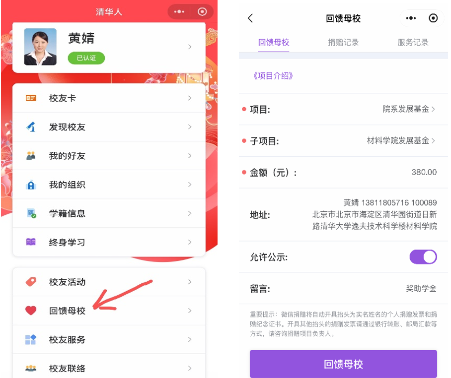 登录清华人小程序,选择回馈母校。项目选择“院系发展基金”,子项目选择“材料学院发展基金”。(默认金额是380元:2026年是材料系成立38周年;数字也可修改成想捐赠的金额)。留言请备注捐赠项目、手机号、班级全称、电子邮箱或微信号和地址。