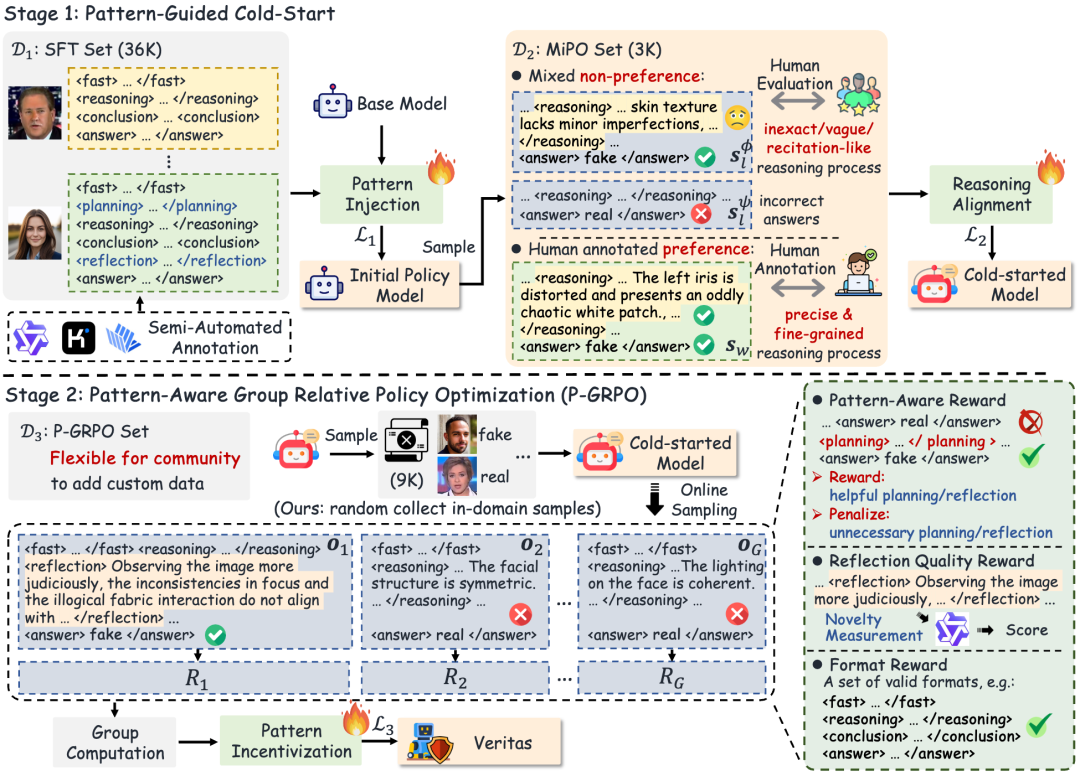 在推理能力与可靠性方面,一条重要方向是通过结构化推理机制增强模型的中间决策质量。Veritas 通过在传统 chain-of-thought 之外引入 planning 与 self-reflection 等关键模式,使模型能够以更接近人工鉴伪流程的方式逐步分析伪造线索;VC-STaR 从视觉对比的角度出发,利用对比式 VQA 样本帮助模型更准确地定位判别性视觉证据,并在此基础上生成质量更高、幻觉更少的视觉推理路径,进而实现视觉推理能力的自我提升。