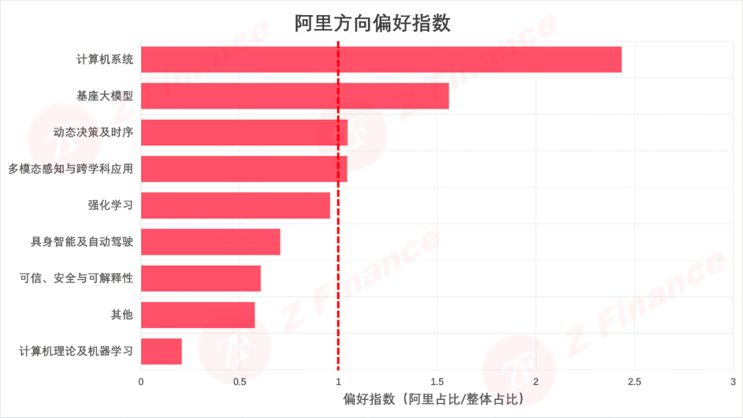 偏好指数 = 阿里在某方向的论文占比 / 整体 ICLR 在该方向的论文占比。偏好指数大于 1 表示阿里在该方向相对超配,小于 1 表示相对低配。