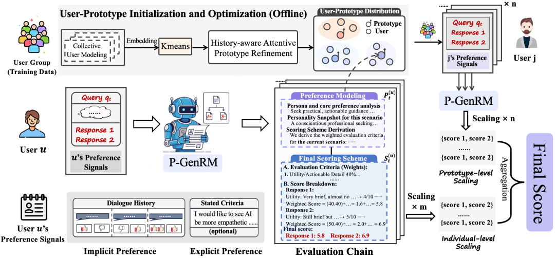 在对齐、交互与决策能力方面,研究关注点则进一步扩展至模型如何在开放环境中适应用户偏好、完成动态任务并实现可扩展的行为优化。P-GenRM 代表了个性化对齐方向的重要进展,其通过将用户偏好表征为结构化评价链,并在测试阶段引入基于个体与原型的双粒度缩放机制,使奖励模型不仅能够适配特定用户的细粒度偏好,还能借助相似用户群体的原型知识增强对新用户的泛化能力。