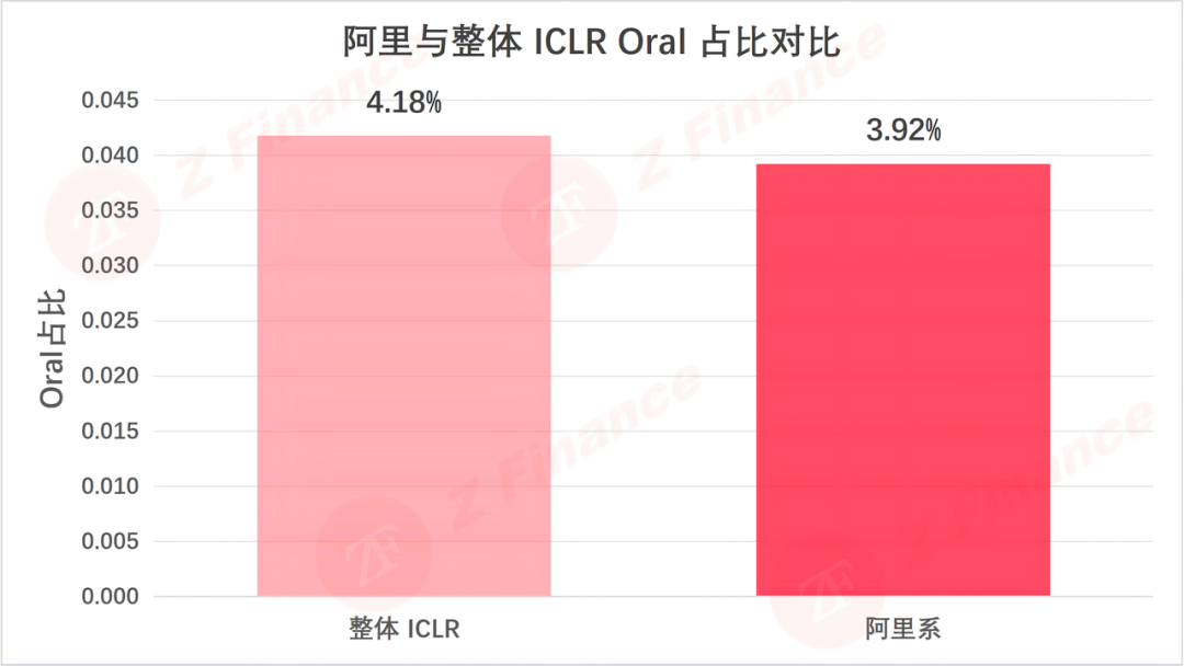 最后看一个硬核指标:Oral 占比。阿里系 Oral 论文 10 篇,占比 3.9%;ICLR 整体 Oral 占比 4.2%。-0.3 个百分点的差距,说明阿里在论文质量上稳住了基本盘,但并未形成显著的精品优势。