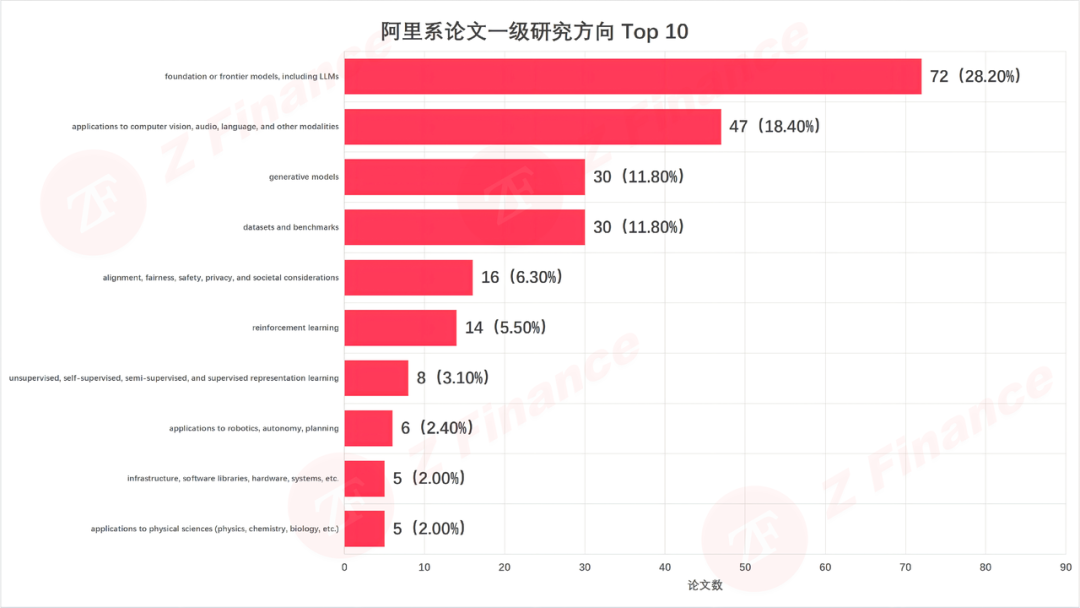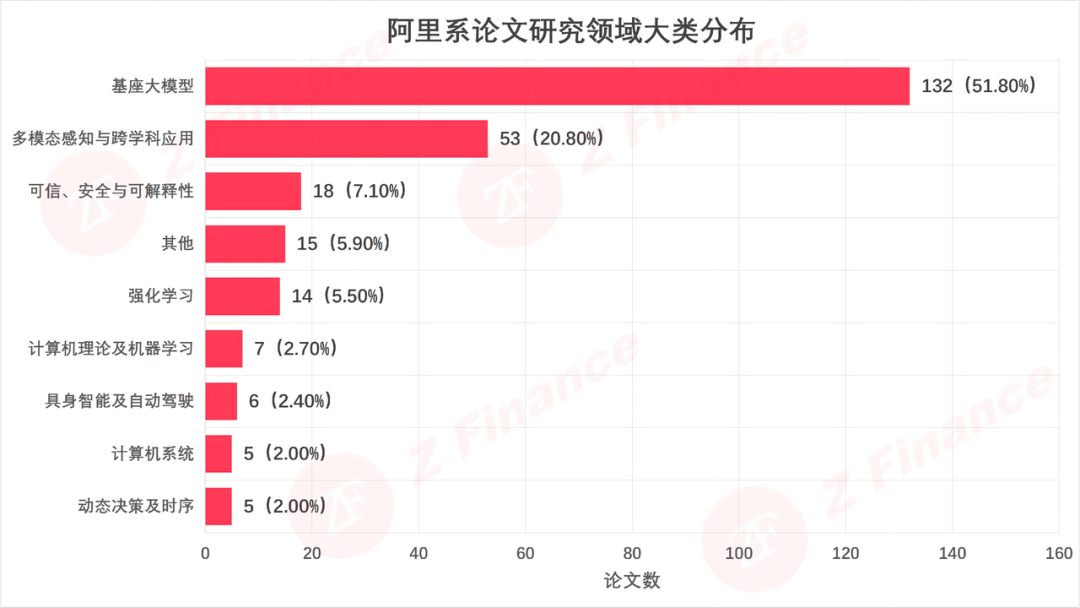如果说论文数量是面子,那研究方向就是里子。阿里系的火力高度集中在两大高地:基座大模型(51.8%)和多模态感知(20.8%)。光是这两个方向,就吞掉了超过七成的弹药。