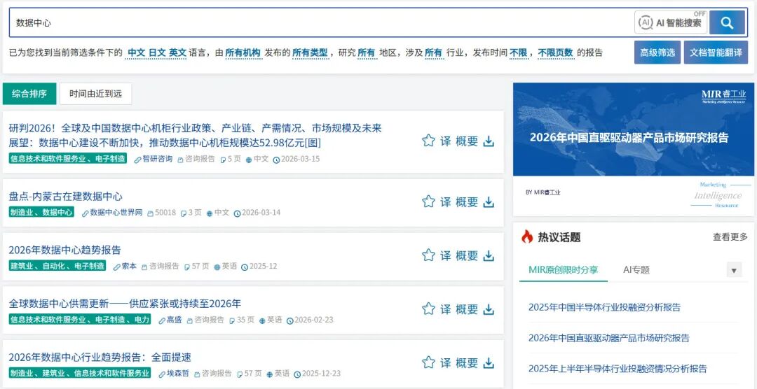 随着人工智能算力需求的快速增长,AIDC(人工智能数据中心)已成为新型基础设施建设的核心环节。为帮助用户全面把握AIDC市场动态与产业链格局,MIR DATABANK将于近期正式上线AIDC相关数据内容。