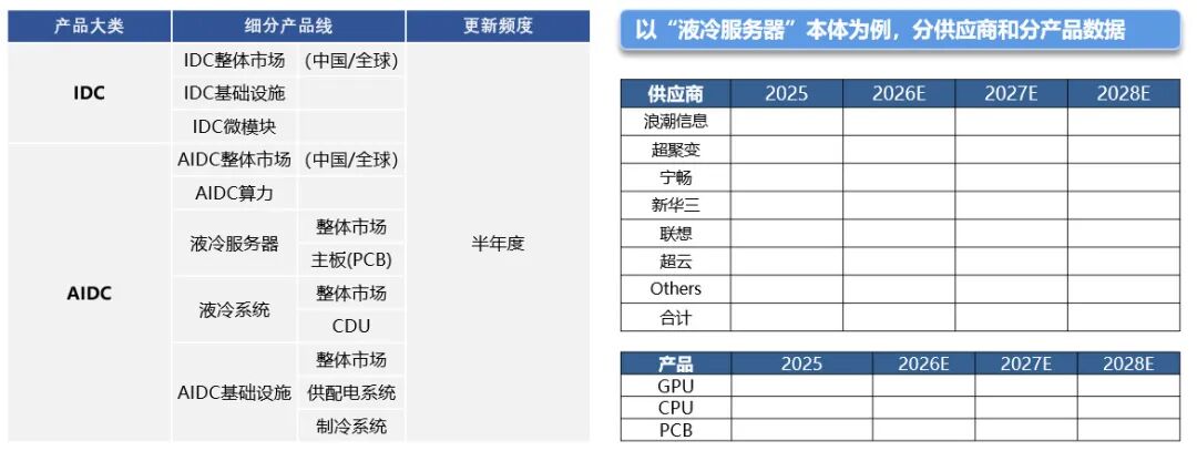 数据覆盖IDC与AIDC领域,其中以AIDC为核心主体,同步监测中国及海外市场情况。统计周期为半年度,各类型统计范围将细分至10余家主要供应商,并同步更新配套的数据解读报告。
