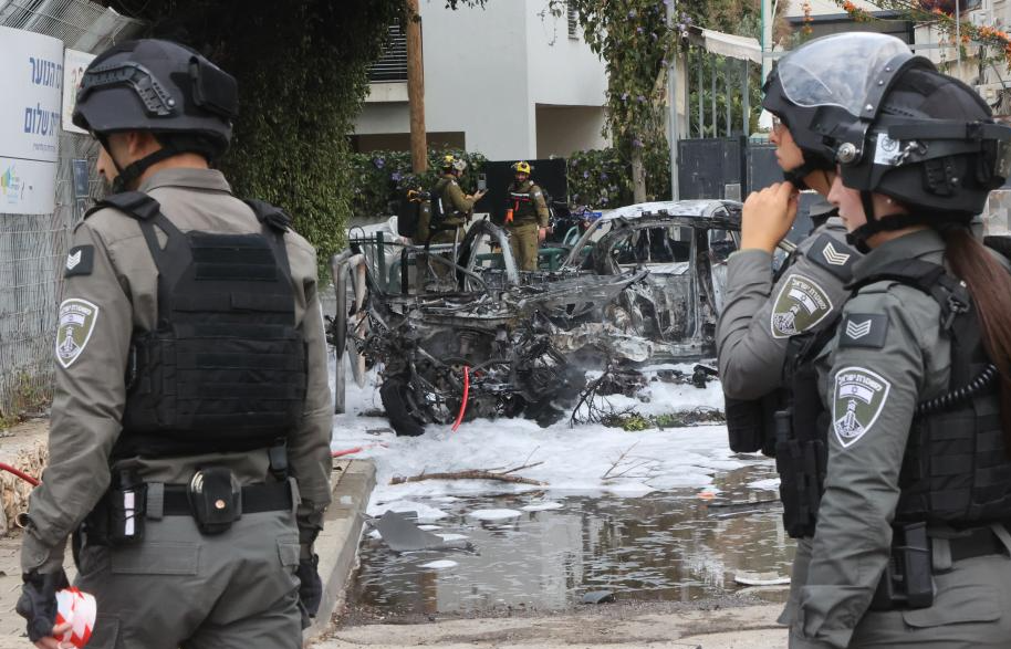 安全人员和应急人员在以色列中部城市特拉维夫的导弹袭击现场工作(图源:新华社)