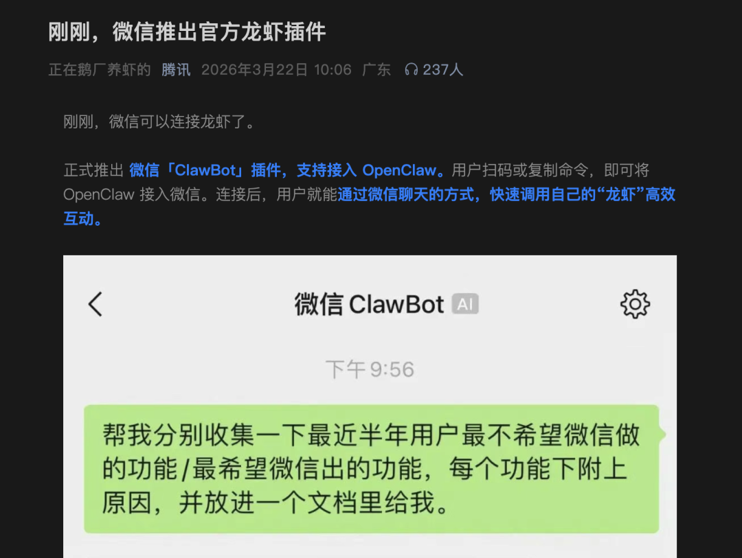 上周末,微信突然上线了一个叫「ClawBot」的插件,就是官方给所有龙虾终于开了微信入口,让你可以在微信里连接上龙虾直接使用。