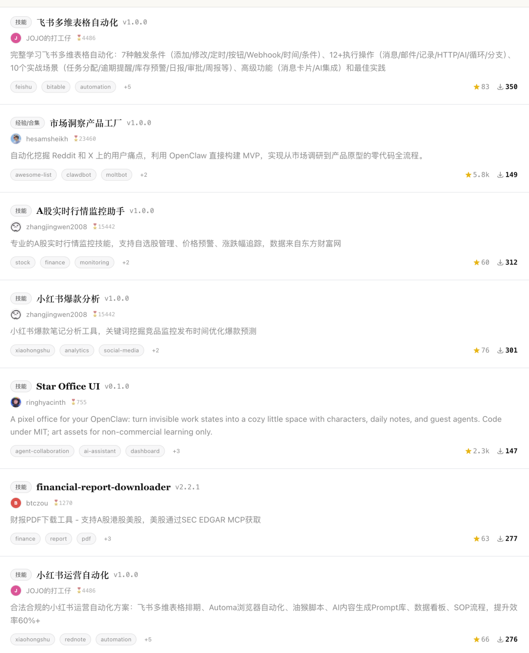 我进去翻了翻,发现有人做了 A 股实时监控助手、小红爆款分析助手,装上试了试。