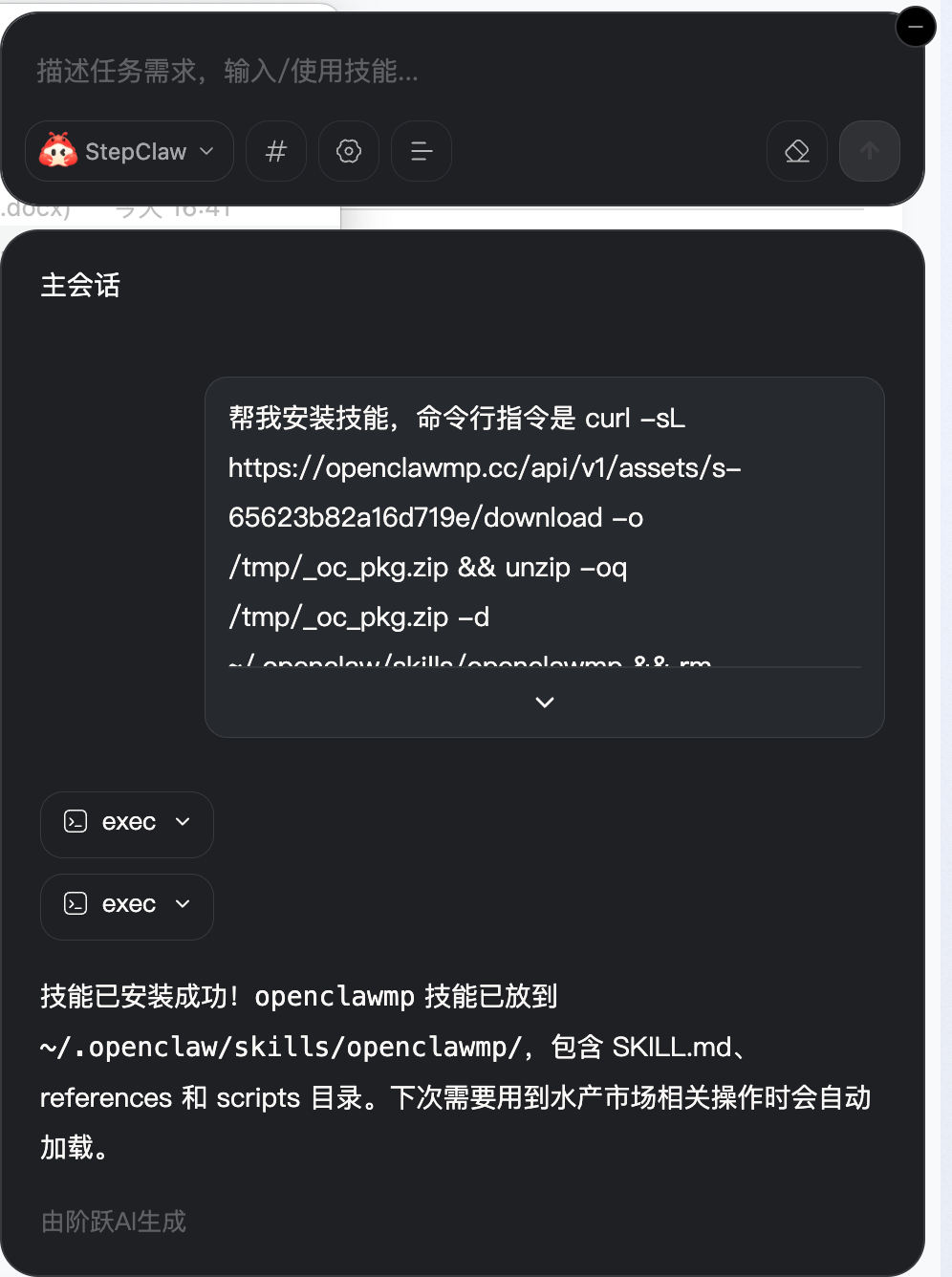 帮我安装技能,命令行指令是 curl -sL https://openclawmp.cc/api/v1/assets/s-65623b82a16d719e/download -o /tmp/_oc_pkg.zip && unzip -oq /tmp/_oc_pkg.zip -d ~/.openclaw/skills/openclawmp && rm /tmp/_oc_pkg.zip