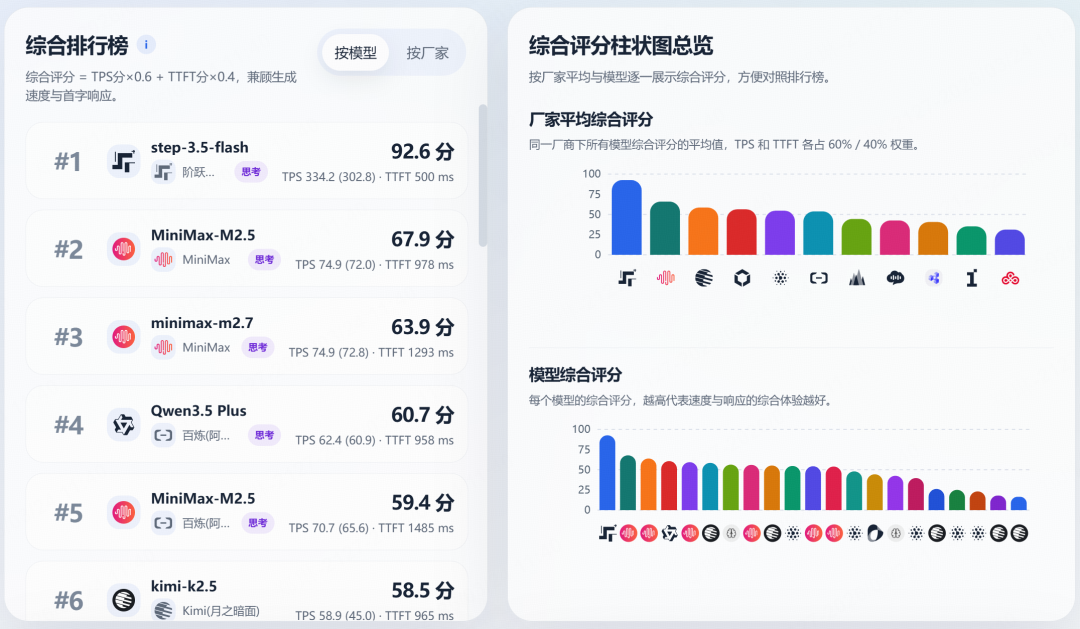 这里的 Step 3.5 Flash 模型实测跑分非常强,几乎是一骑绝尘,以 92.6 分拿下 Coding Plan Benchmark 综合榜首,TPS 和 TTFT 两项关键指标同步领先。