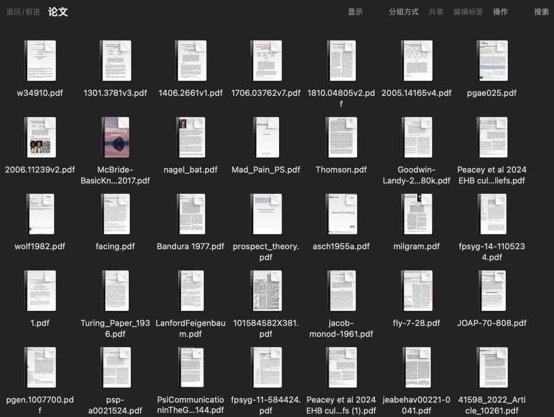 我平时喜欢通过文献学英语,顺带扩展下视野,所以看到感兴趣的论文就下意识往电脑里丢。各个学科、各种来源,PDF 越积越多。但论文这个东西你也知道,不同渠道下载下来的文件名是乱的。囤着囤着就忘了是啥内容,想整理又觉得太费劲。就像这样:
