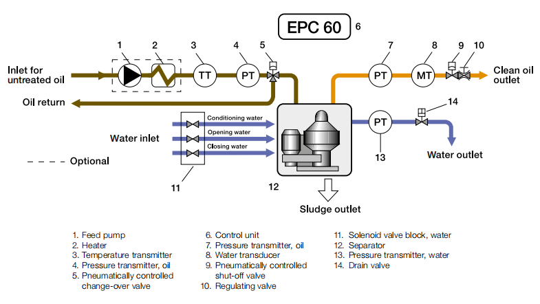 5.净化油收集与系统监控:转鼓内配备阿法拉伐专利集油管与集油盘,二者协同工作实现净化油的高效收集。集油管采用自适应设计,可根据油水相界面的变化自动调整位置,精准贴合纯油层与水层的分界面,既能高效分离并排出残留水分,又能避免纯油进入水层造成损耗;集油盘则固定在转鼓中心区域,将分离后的纯油泵出至清洁油出口,输出的净化油纯度可达99.9%以上,完全满足发动机等设备的使用要求。运行全程,EPC 60控制器实时监测多个关键参数,包括:进料压力、分离压力、油压(控制范围2-8bar)、污泥罐液位、设备振动(选配振动传感器时,振动阈值可设定,超标触发报警)、电源电压(三相220V-690V)、控制气压(5-8bar)等,所有参数均实时显示在LCD显示屏上。一旦出现参数异常(如油压过高、振动超标、电源不稳定等),控制器立即通过LCD显示屏以文字形式发出明确报警,同时可触发应急安全停机,避免设备损坏或分离效果不达标,全方位保障系统稳定、安全运行。
