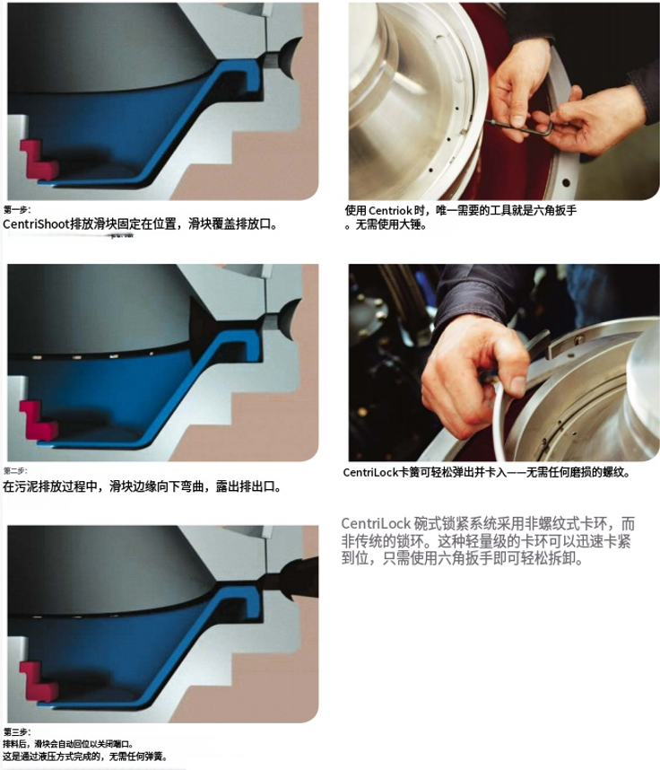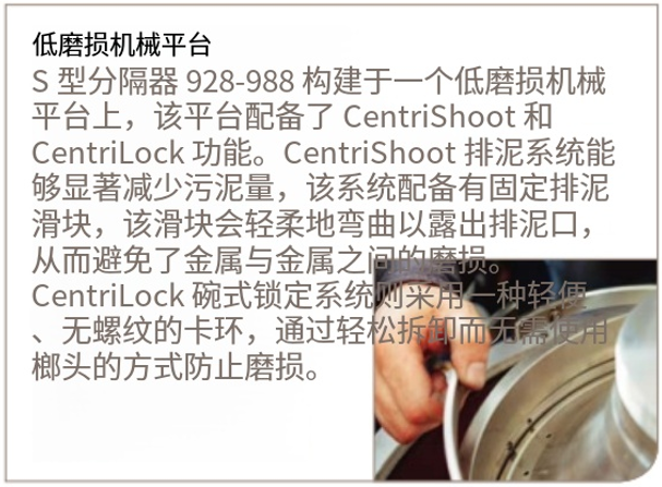 系统构建以CentriShoot排渣系统和CentriLock转鼓锁定系统为核心的低磨损平台,从结构上消除传统分离设备的金属间硬摩擦,降低设备损耗: