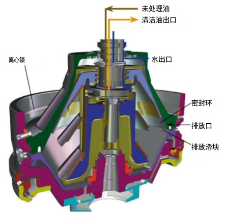 2.离心驱动分离:分离器主体的动力来源于专用电机,电机通过摩擦离合器和高强度传动皮带驱动转鼓运转,摩擦离合器可有效缓冲启动时的冲击力,保护电机与转鼓部件。转鼓固定在主轴顶端,主轴由高精度轴承与特殊复合弹簧支撑,可有效抵消转鼓高速旋转产生的振动,确保设备稳定运行。转鼓转速根据油品类型与处理量调整,范围为3000-6000r/min,利用离心力差(离心力是重力的数千倍)实现油、水、杂质的快速分层:污泥、固体杂质(如催化细粉)密度最大(大于1010 kg/m³),在离心作用下快速聚集于转鼓最边缘;水分密度次之(约1000 kg/m³),位于污泥层内侧,形成水层;纯油密度最小(小于950 kg/m³),向转鼓中心区域汇集,形成纯油层。转鼓与碟片组采用优化设计,最大化离心分离的有效面积,进一步加速分层速度,缩短分离周期。