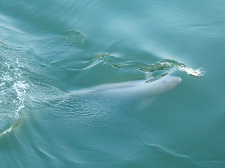 “这是我第二次在港区拍到江豚,而且一天内就遇到了3只,它们和海鸥、小鱼嬉戏,在水中十分惬意自在,我也被感染,工作的疲劳感都消散了。”月初,正在检查门机维修情况的日照港技术创新中心东区维修中心党支部书记、经理王佳佳,拍摄到江豚在港区捕鱼的画面。