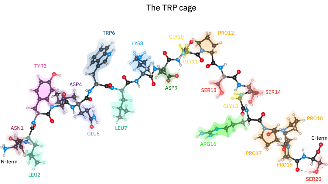 在生物学中,理解蛋白质如何折叠、如何与水分子相互作用,是理解生命活动最底层的“说明书”。Trp-cage(色氨酸笼)虽然被称为“微型蛋白质”,但在生物物理学中是一个极具代表性的范例。它仅由20个氨基酸组成,却拥有完整的折叠特征、疏水核心以及复杂的氢键网络。模拟它的电子结构,要求算力必须能够精确捕捉数百个原子之间错综复杂的电子相互作用。
