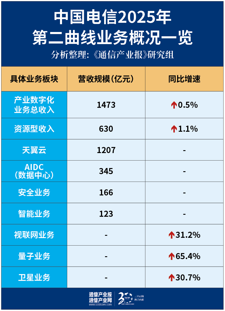 2025年,中国电信产业数字化业务收入达到人民币1473亿元,同比增长0.5%,其中资源型收入达到人民币630亿元,同比增长1.1%。战新业务继续保持较快增长,天翼云收入达到人民币1207亿元,公有云IaaS市场份额升至国内第二,IaaS+PaaS市场份额居国内前三。