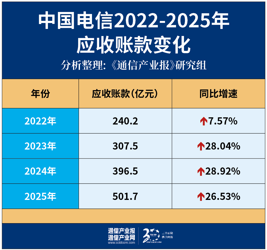 中国电信的应收账款在2025年再创新高,2022年—2025年,中国电信应收账款分别为240.2亿元、307.5亿元、396.5亿元、501.7亿元,同比分别增长7.57%、28.04%、28.92%、26.53%。