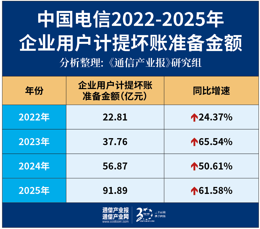 探究坏账计提的原因,不难发现,中国电信企业用户坏账准备增长尤为迅速,2022年—2025年,中国电信的企业用户计提坏账准备金额分别为22.81亿元、37.76亿元、56.87亿元、91.89亿元,同比分别增长24.37%、65.54%、50.61%、61.58%。