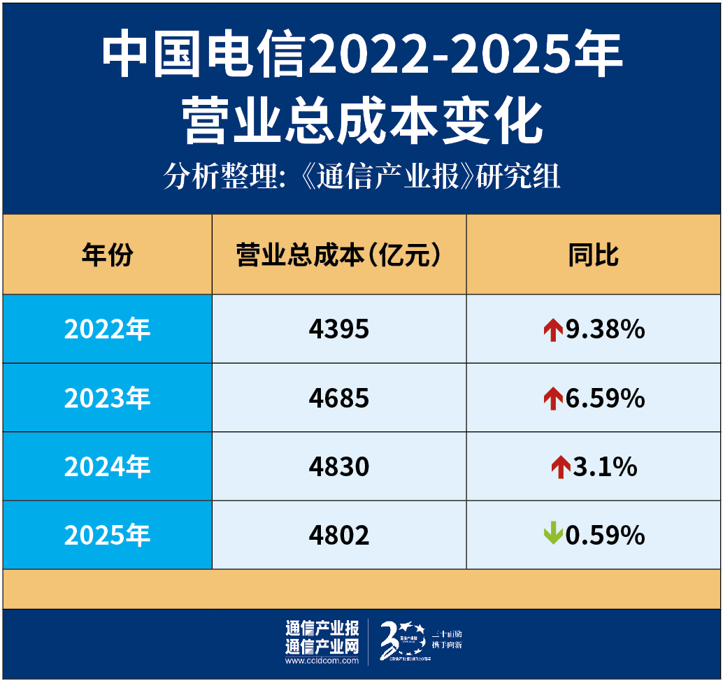 中国电信在收拾资本开支的同时,2025年,中国电信在成本控制方面下足了功夫,“降本增效”贯穿全年。2022年—2025年,中国电信营业总成本分别为4395亿元、4685亿元、4830亿元、4802亿元,同比分别增长9.38%、6.59%、3.1%、-059%,营收总成本在2025年出现罕见的下滑。