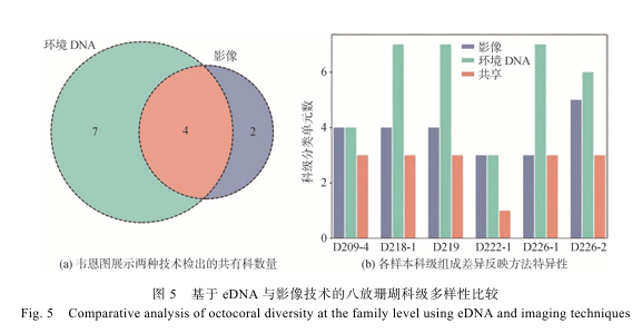 环境DNA宏条形码技术和影像分析在深海八放珊瑚多样性研究中具有互补性。影像技术能够直观反映珊瑚的丰度特征和空间分布, 而 eDNA 技术则在检测隐匿物种和稀有类群方面表现出更高的灵敏度。本研究表明, 二者结合能够更全面地揭示深海珊瑚群落的特征, 有效弥补各自方法的局限性, 从而构建更全面、准确的多样性评估体系。 未来研究应继续优化eDNA样本的提取与扩增流程, 提高其在复杂深海环境中的适应性与重复性。同时, 推动 eDNA 和影像技术的深度结合, 有助于更深入地理解深海珊瑚生态系统的多样性和动态变化。